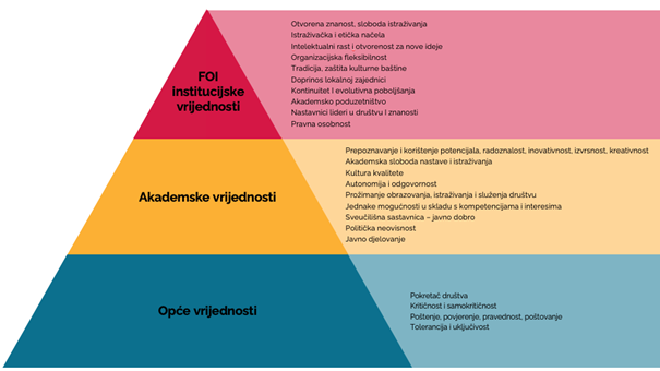 Na vrhu piramide ističu se specifične vrijednosti koje SUZG FOI smatra prioritetima u svojem djelovanju. To su društvena odgovornost, akademsko poduzetništvo, održivost, povezanost s gospodarstvom i zajednicom te razvoj vještina koje su prilagođene potrebama tržišta rada. Navedene vrijednosti SUZG FOI integrira u svoje strateške ciljeve i aktivnosti, s naglaskom na dugoročni doprinos zajednici, odgovorno korištenje resursa te obrazovanje studenata koji će kao budući stručnjaci pridonositi pozitivnim društvenim promjenama.