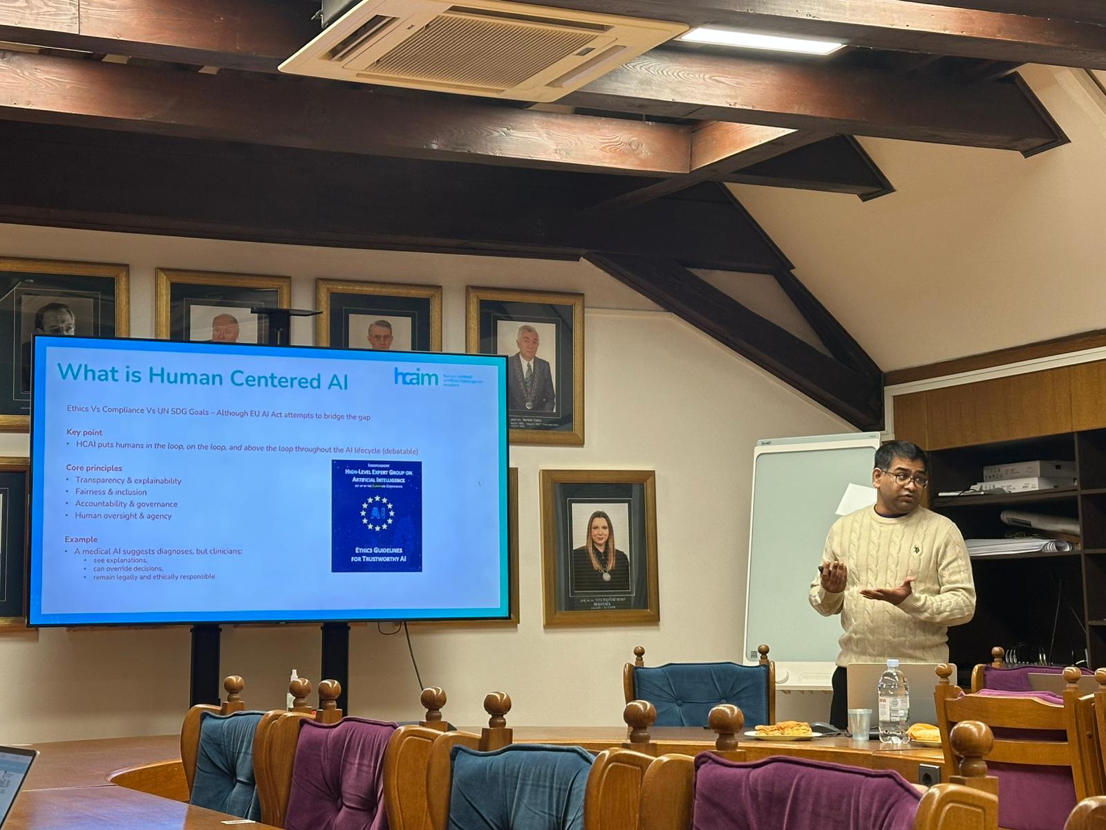 Predavanje je bilo usmjereno na načela i suvremene prakse umjetne inteligencije usmjerene na čovjeka (Human-Centered Artificial Intelligence – HCAI), s posebnim naglaskom na diplomski studij Human-Centered AI and Machine Learning (HCAIM), financiran sredstvima Europske unije. Predavači su istaknuli kako je ovaj studijski program osmišljen kao odgovor na rastuću potrebu za razvojem AI sustava koji u središte stavljaju ljudske vrijednosti, transparentnost i društvenu odgovornost.