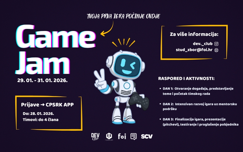 Game Jam se održava na FOI-ju (točna lokacija bit će objavljena naknadno) i osmišljen je da spoji kreativnost, timski rad i praktično iskustvo u stvaranju igara.