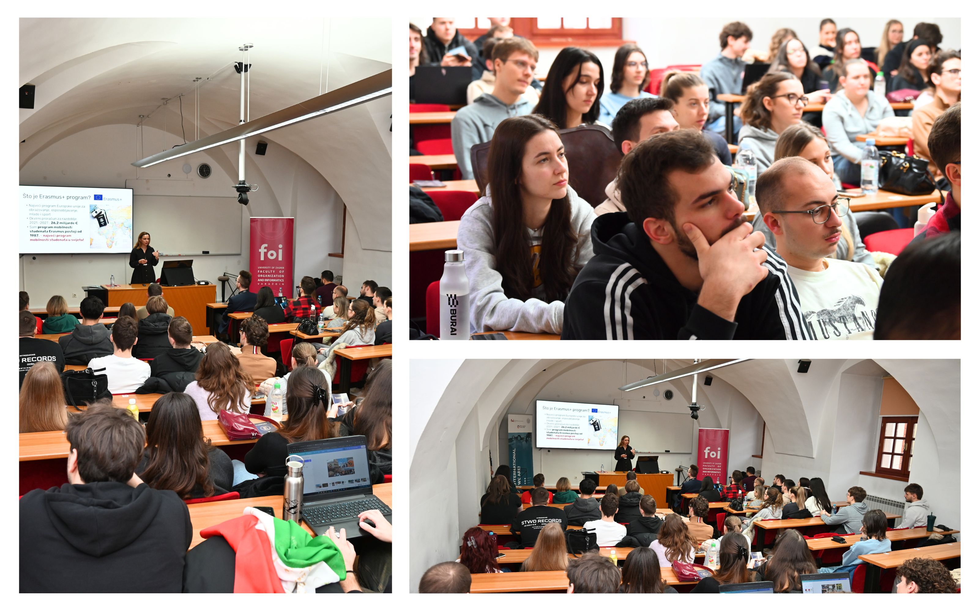 Studente je uvodno pozdravila prodekanica za znanost, projekte i međunarodnu suradnju, izv. prof. dr. sc. Martina Tomičić Furjan, nakon čega je Izabela Oletić Tušek, voditeljica Centra za međunarodnu suradnju FOI-ja, predstavila program Erasmus+ općenito, mogućnosti studijskog boravka, postupak prijave, natječaj te partnerska sveučilišta za razmjenu. Osim studijskog boravka, studenti mogu sudjelovati i u Erasmus+ stručnoj praksi te Erasmus+ intenzivnim kombiniranim programima (BIP-ovima). Erasmus+ stručnoj praksi posvećuje se posebna pažnja tijekom Tjedna karijera, kao i na tribini koja se svake godine održava u studenome. Erasmus+ BIP-ovi također su popularna opcija među FOI studentima, koju su u posljednje tri godine aktivno koristili zahvaljujući brojnim dostupnim natječajima.