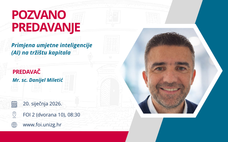 U utorak, 20. siječnja 2026. godine, u sklopu kolegija Osobne financije na sveučilišnom prijediplomskom studiju Ekonomika poduzetništva pozvano predavanje će održati mr. sc. Danijel Miletić, osnivač i vlasnik konzultantske tvrtke CapsLock za poslovno i IT savjetovanje te srodna područja uključujući digitalnu transformaciju, pod nazivom „Primjena umjetne inteligencije (AI) na tržištu kapitala“. Pozvano predavanje počinje u 8:30 sati, u dvorani 10 na FOI 2 i otvoreno je za sve zainteresirane studente!