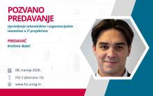 Pozvano predavanje na temu "Upravljanje tehnološkim i organizacijskim izazovima u IT projektima" održat će u srijedu, 8. travnja 2026. godine Krešimir Babić iz OTP banke. Predavanje će biti održano od 13:15 do 14:30 sati u sklopu nastave na kolegiju Uvod u IT projekte (dvorana 10, FOI 2).