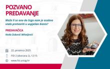 U ponedjeljak, 22. prosinca 2025. godine, u sklopu kolegija Poduzetničke strategije na sveučilišnom Diplomskom studiju Ekonomika poduzetništva održat će se pozvano predavanje poduzetnice Nede Zubović Mihaljević pod nazivom 'Može li se ono do čega nam je osobno stalo pretvoriti u uspješan biznis?'. Pozvano predavanje počinje u 12:15 sati na FOI 2 u dvorani 2 i otvoreno je za sve zainteresirane studente.