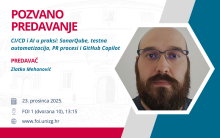 U utorak 23. prosinca 2025. godine u sklopu kolegija Uzorci dizajna na sveučilišnom diplomskom studiju Informacijsko i programsko inženjerstvo održat će pozvano predavanje Zlatko Mehanović iz tvrtke Emil Frey Digital pod nazivom „CI/CD i AI u praksi: SonarQube, testna automatizacija, PR procesi i GitHub Copilot“. Pozvano predavanje počinje u 13:15 sati na FOI 1 u dvorani 10 i otvoreno je za sve zainteresirane studente.