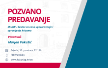 Pozvano predavanje Marjana Vukušića (Ministarstvo unutarnjih poslova, Samostalni sektor za informacijske i komunikacijske sustave) održat će se u srijedu 10. prosinca 2025. godine s početkom u 12:15 sati u sklopu nastave na kolegiju Privatnost i osobni podaci (FOI 1, dvorana 7). Tema predavanja je SRUUK - Sustav za rano upozoravanje i upravljanje krizama.